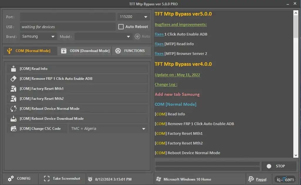 - Select Mode: Choose between COM (Normal Mode), ODIN (Download Mode), MTP, or ADB functions based on your needs.