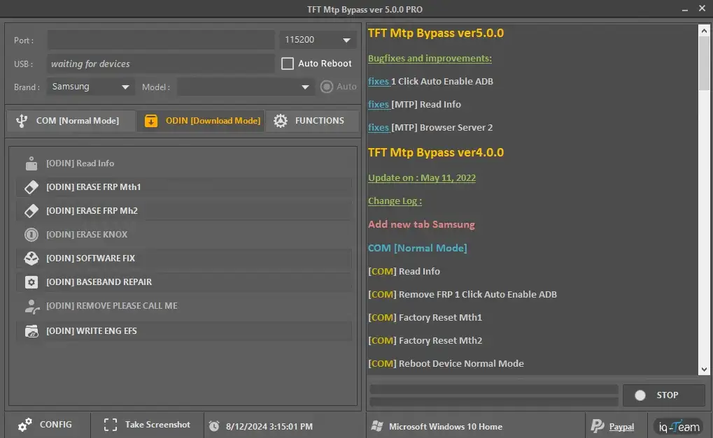 - Connect Your Device: Connect your Samsung device to your PC via USB. The tool will detect the device on the specified port (e.g., Port 115200, as shown in the screenshot).